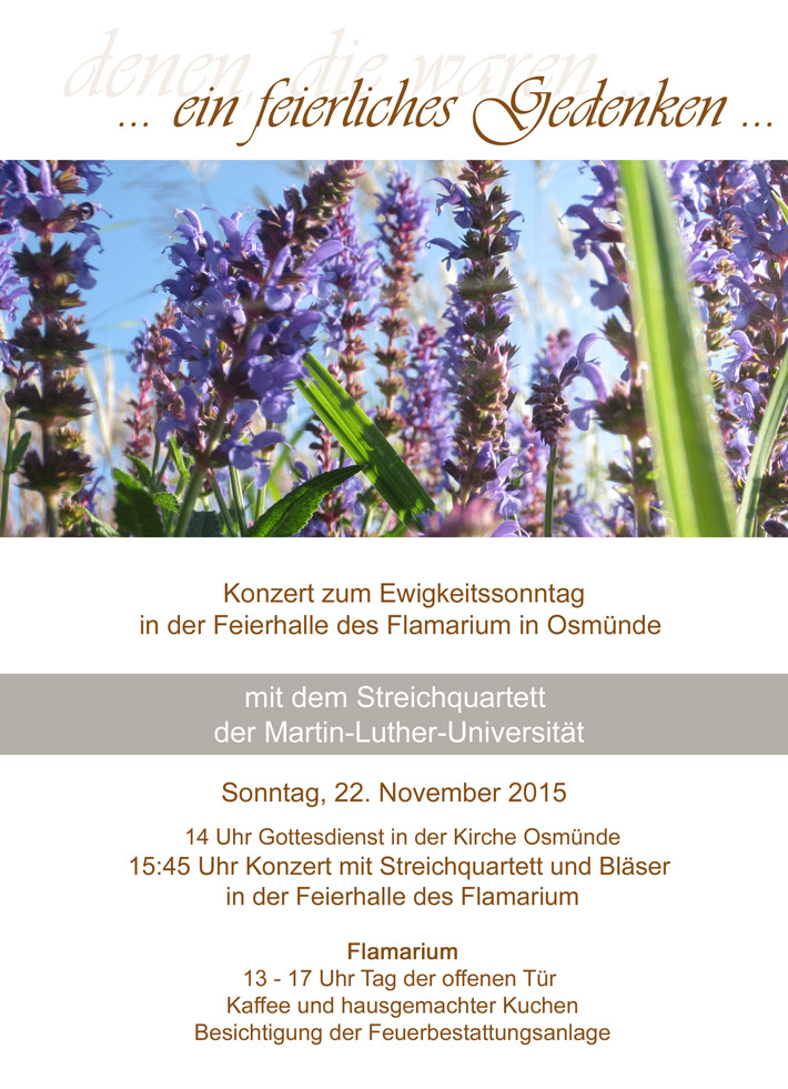 Das Flamarium in Osmünde lädt zwischen 13 und 17 Uhr zum Tag der offenen Tür ein. Es gibt selbstgebackenen Kuchen und Kaffee im Friedhofscafé. Unserer Mitarbeiter und Mitarbeiterinnen stehen für Führungen durch die Feuerbestattungsanlage und den Friedgarten Mitteldeutschland zur Verfügung. Ab 15:45 Uhr spielt das Streichquartett der Martin-Luther-Universität Halle/Wittenberg in der Feierhalle ein Gedenkkonzert.